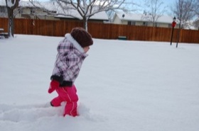 Ever since Macey woke up this morning she’s been yelling “Snow, snow!”. We finally got to go play in it after lunch and in true Macey form she dove right in. Despite falling and getting very wet she couldn’t get enough of running through the snow and throwing it at me.