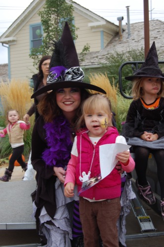 Macey was a bit sad when she noticed alot of the other kids were all dressed up and she wasn’t (we’ll do better next year). She kept asking to be a Witch, but she had to settle for getting a witch painted on her face and making some Halloween jewelry instead.