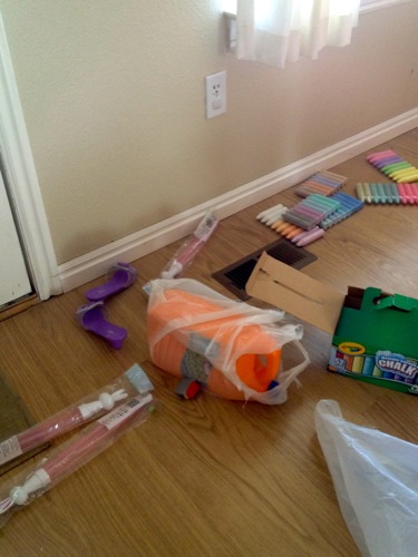 This morning it was when my door bell rang and I found bubbles and sidewalk chalk on my porch left by a generous neighbor. It was a welcome surprise since Paul isn’t home today and I desperately needed something to entertain Macey and Miles with that did not involve technology.